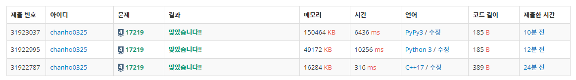 - cpp는 맵, 파이썬은 딕셔너리 사용