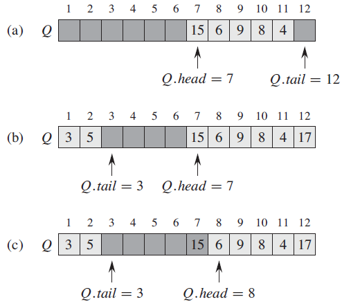 $Q.head = Q.tail$인 경우 큐가 비어있는 상태이다. 초기에는 $Q.head = Q.tail = 1$이다.