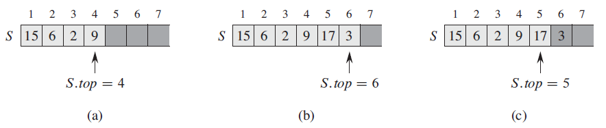 즉, 스택은 원소 $S[1 \cdots S.top]$을 가지고 있고, $S[1]$은 스택 최하단에, $S[S.top]$은 스택 최상단에 위치한다.